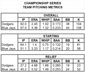 This is going to be a battle of the teams’ strengths in the 121st edition of the MLB World Series: Dodgers Starting Pitching vs. Blue Jays Bats.  The adage is that good pitching beats good hitting.  That is not what happened against the Mariners, but that pitching staff was worn out.  The Dodgers rotation is in peak form.