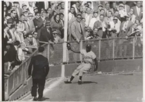 October 6th, 1963. 55,912 showed up for game 4. Koufax was on normal rest. Both pitchers were at their best through the first four innings. Koufax retired the Yanks in the 5th and LA came to bat. Frank Howard led off the inning and hit a mammoth homer down the left field line that went into the loge level. Mickey Mantle hit his only homer of the series off of Koufax to tie it in the 7th. In the bottom of the 7th, Gilliam hit a high chopper to third. Clete Boyer leaped and caught the ball and fired to first. But Joe Pepitone lost the ball in the white shirted background. It caromed off of his arm and rolled down the right field line. Gilliam went all the way to third base.