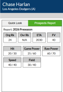 3B – There are 7 3B prospects in the system.  Kyle Nevin is probably mislabeled as a 3B vs 1B.  He will be at OKC and will probably move back to 1B if Alex Freeland is optioned back to OKC.  Perhaps the best 3B prospect in the system is 19 year old Chase Harlan.  He reached low A last year, and played (hit) decently.  Do not know about his defensive play last year.  He is #23 rated by MLB Pipeline and #24 by Fangraphs.  Below is his Fangraphs scouting grades: