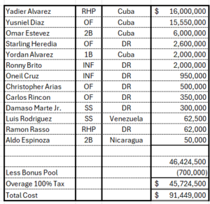 The Dodgers went all-in on the international market in 2015, spending more than $150 million on signing bonuses, guaranteed salaries and tax penalties for exceeding their pool allotment. After committing $62.5 million for Hector Olivera, their second-biggest expenditure was a $16 million bonus and matching penalty for Yadier Alvarez, Yusniel Diaz, and Sterling Heredia…After this draft, the Dodgers were penalized for the next two years, with a decimated bonus pool and not allowed to sign any player for more than $300K. It also cost a lot of interntional scouts their jobs with the Dodgers. The full list of 2015 IFA signings and their allotted signing bonuses.