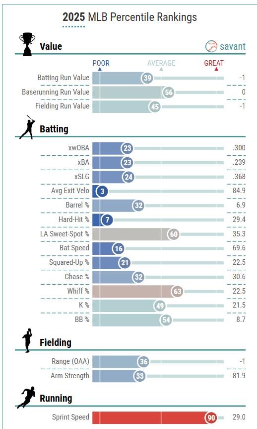 I was an advocate of Matt Shaw, and then I saw his statcast page (see below). 3rd percentile for avg exit velo, and 7th percentile for hard hit? Not good for a corner infielder. Other than speed, he is almost all blue. and no other red. He did have a couple tweeners (< 70 percentile) for launch angle sweet spot and whiff %.